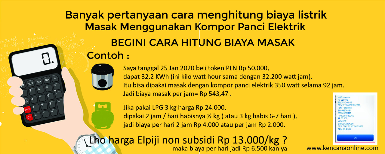 Biaya masak 1-2 jam per hari dengan Lpg menghabiskan 1/2 kg adalah Rp 6.500, sementara biaya listrik Kompor Panci Elektrik PC 6-1 350 watt per 2 jam setara 0,7 KWh. Pada tarif listrik PLN Rp 1500/ KWh, biaya masak secara elektrik ini hanya sekitar Rp 1000/ 2 jam terus menerus.