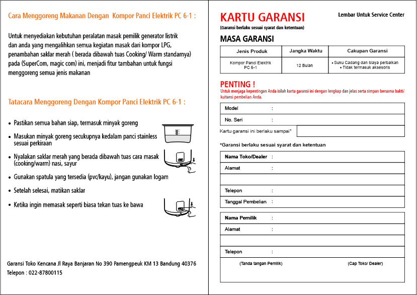 Produk bergaransi toko kami ini adalah alat masak listrik yang ada di pasaran dilengkapi saklar khusus sehingga bisa digunakan menggoreng. Untuk anda yang mau migrasi masak dari LPG ke sumber energi listrik PLN, maupun pemilik generator* ) untuk bebaskan biaya masak rumah tangga dan usaha kecil, akan pembelian LPG/ Elpiji.