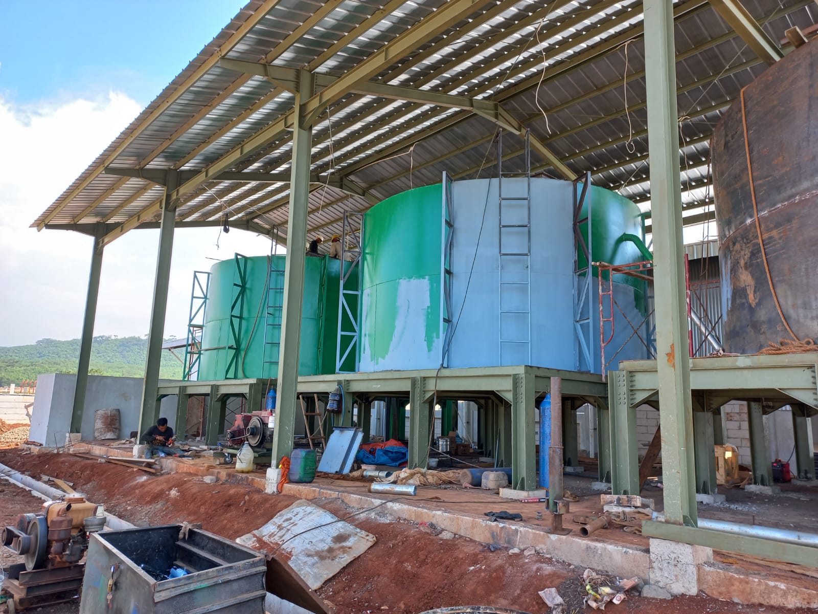 3. Tangki biomass Treatment ( underground 1 m3, dan 4 ISO tank 1000 L untuk supply ke 3 Tangki Digester, mengendapkan sementara hingga material ( slurry) memenuhi syarat bagi proses fermentasi sempurna ( C/N ratio, PH, kandungan air)