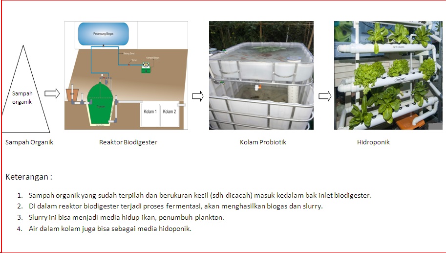 Lumpur ( bio slurry) dengan pompa lumpur dialirkan ke filter dan Kolam probiotik portabel ( KPP 1000 L) yang terbuat dari tangki 1000 liter yang dilengkapi dengan catridge (inlet aktivator) bakteri penumbuh pakan alami atau plankton. Berdimensi PLT ( 1 x 1x 1,2 ) m memiliki kapasitas penampung air kolam per unit 1 m3, setiap unit dilengkapi aerator oksigen. Perolehan kompos 60 kg padat kolam KPP 1000 L, dicampur 1:1 dengan tanah, dijadikan media tanam polibag padi. Cairan sebanyak 100 liter dicampur air menjadi media tumbuh ikan, di sirkulasi ke Pot Vertikultur menjadi media tanam sayuran secara hidroponik dan berakhir di areal sawah portabel.