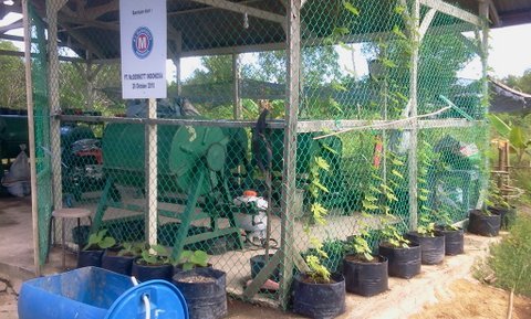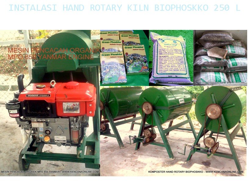 Instalasi Produksi Kompos BioPhoskko HRE 500 L (Tipe Hand Rotary Elektrik), dengan jumlah 5 unit masing-masing berdimensi (tinggi = 100 cm, lebar= 67 cm dan panjang = 90 cm) terbuat dari bahan fiber resin murni (fiberglass) bahan resin PL 07 LPE, jenis mat Wr 400 (mat anyam) dan mat Jushi -Kwe 300 (acak) 300 x 104, catalyst butanox, mirror glase, pigmen HCA dolphin green serta aerosil HDK ini memiliki ketebalan dinding 3 – 5 mm, reducer gear box 1:80, lubang aerasi, motor listrik 1 PK 3 Phase.