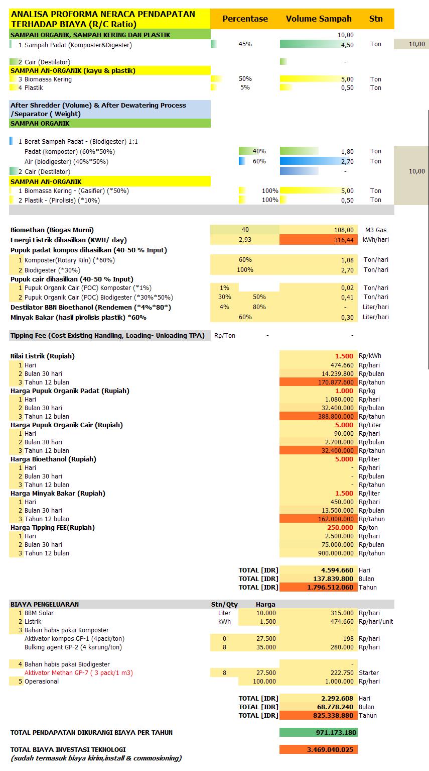 Perolehan konversi dari sampah domestik TPST ME 10 T meliputi kompos ( bagian terbesar), biogas ( yang kemudian dijadikan bahan bakar energi pembangkit listrik), dan minyak bakar (heavy oil) sebagai pencampur BBM genset listrik. Memerlukan luas lahan mulai 350 m2. Pada penggunaan oleh peminat bisnis kecil yang memberikan jasa pengolahan sampah kepada kawasan komersial maupun pemerintah, pada besaran tiping fee Rp 250.000/ ton, TPST ME 10 T sudah memiliki kelayakan ekonomi, memenuhi syarat buangan emisi (lingkungan) maupun layak sosial ( bebas bau, tanpa ada bising dan cemaran merugikan lingkungan sekitar).