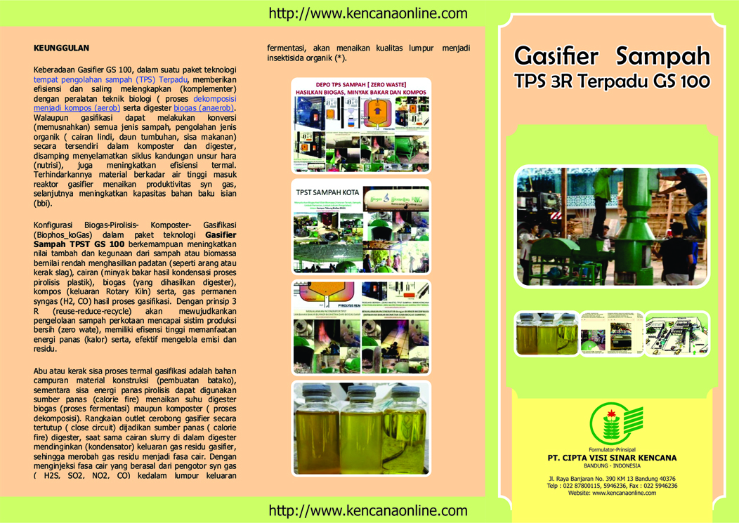 Reaktor Gasifier GS 50 terbuat dari logam plat esser 7 mm berdimensi PLT ( panjang = 2,30 m, lebar= 1,42 m, tinggi= 1,5 m), ketebalan bata tahan api ( castable/ refractory brick) min 7 cm, ketahanan menerima beban temperatur tinggi 1000 o C. Gasifier dilengkapi burner, blower berpenggerak motor listrik (0,5 HP, 1 Phase), siklon (cyclon) pemisah debu kasar, pengendap tar. Kapasitas konversi reaktor Gasifier GS 50 sebesar 50 kg sampah/ jam atau setara lebih 3 m3/ hari.