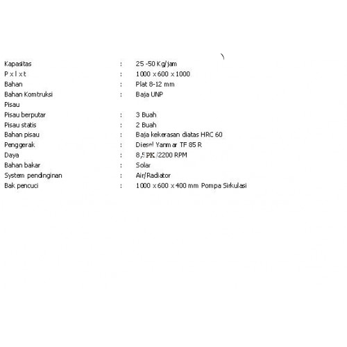 Pisau Berputar : 3 buah, Pisau statis : 2 buah, bahan pisau : baja kekerasan diatas HRC 60, Penggerak : Diesel Yanmar TF 85, daya : 5.5 DK/2200 RPM, Bahan Bakar : solar, system pendinginan : air/radiator , bak pencuci fiberglass dengan dimensi (panjang, lebar, tinggi) PLT : 1000 x 600x 400 berikut pompa sirkulasi.
