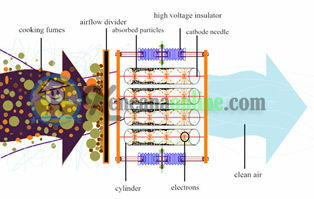 Alat pengendap elektrostatik ini menggunakan arus searah (DC) yang mempunyai tegangan antara 25 – 100 kv. Alat pengendap ini berupa tabung silinder di mana dindingnya diberi muatan positif, sedangkan di tengah ada sebuah kawat yang merupakan pusat silinder, sejajar dinding tabung, diberi muatan negatif. Adanya perbedaan tegangan yang cukup besar akan menimbulkan corona discharga di daerah sekitar pusat silinder. Hal ini menyebabkan udara kotor seolah – olah mengalami ionisasi. Kotoran udara menjadi ion negatif sedangkan udara bersih menjadi ion positif dan masing-masing akan menuju ke elektroda yang sesuai. Kotoran yang menjadi ion negatif akan ditarik oleh dinding tabung sedangkan udara bersih akan berada di tengah-tengah silinder dan kemudian terhembus keluar.