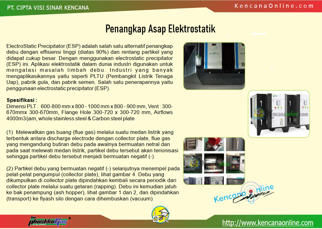 ElectroStatic Precipitator (ESP) adalah salah satu alternatif penangkap debu dengan effisiensi tinggi (diatas 90%) dan rentang partikel yang didapat cukup besar. Dengan menggunakan electrostatic precipitator (ESP) ini, jumlah limbah debu yang keluar dari cerobong diharapkan hanya sekitar 0,16% (dimana efektifitas penangkapan debu mencapai 99,84%). Aplikasi elektrostatik dalam dunia industri digunakan untuk mengatasi masalah bau restoran komersial, limbah debu. Industri yang banyak mengaplikasikannya yaitu seperti PLTU (Pembangkit Listrik Tenaga Uap), pabrik gula, dan pabrik semen. Salah satu penerapannya yaitu penggunaan electrostatic precipitator (ESP).