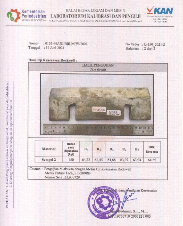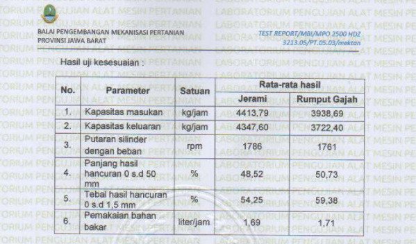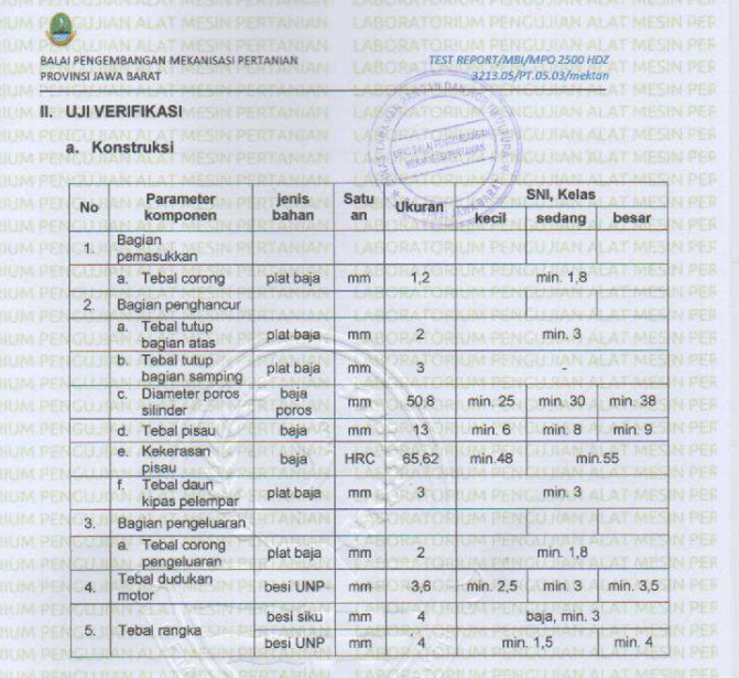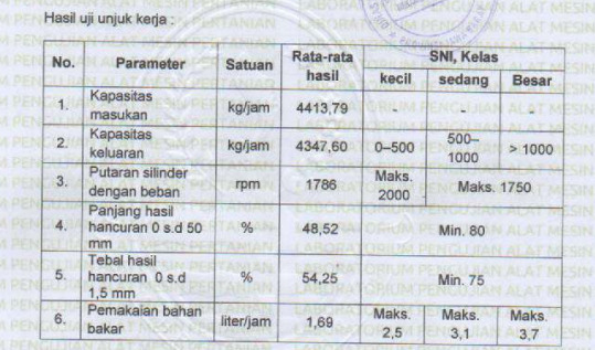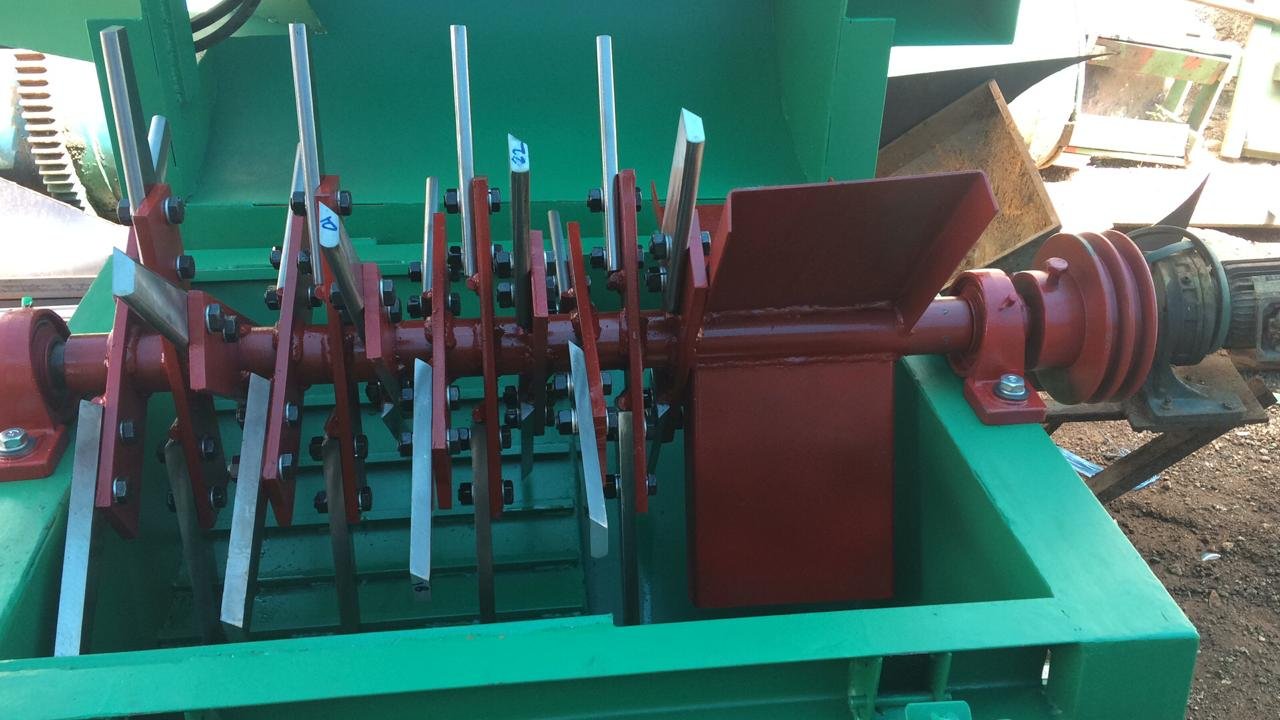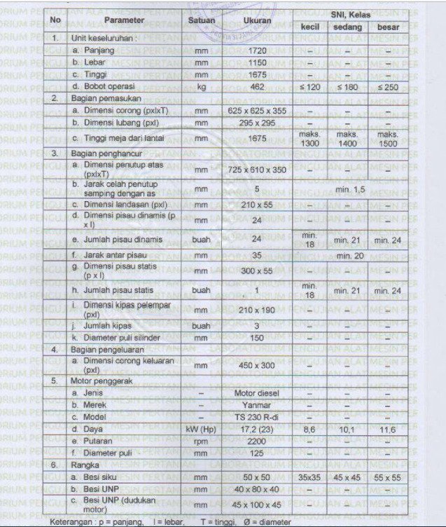 Dimensi Panjang -Lebar- Tinggi ( 1850 mm x 1000 mm x 1500 mm), dimensi pisau ( 200 mm x 65 mm x 4 mm), jumlah pisau 24, jumlah pelempar 3 buah, jarak antar pisau 30 mm, kekerasan pisau HRC , diameter dudukan pisau 4 Inchi,