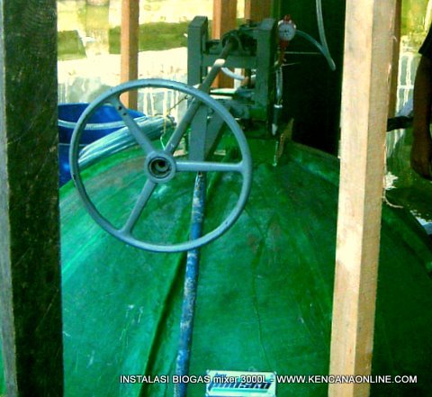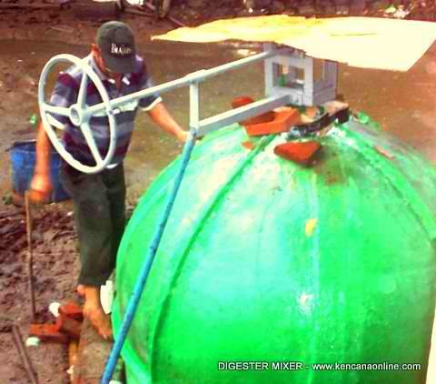 Pembangkitan biogas untuk mencapai kualitas terbaiknya, disamping menyiapkan material bahan baku agar mencapai kadar perbandingan Carbon terhadap Nitrogen (C/N) = 20-30, juga memerlukan pengelolaan lingkungan mikro pada bak cerna (digester) agar tercapai PH optimum (6 sampai 7), temperatur mesofilik ( 25 sd 40 derajat Celcius) serta pencampuran yang homogen untuk terhindarnya pengendapan material padat (total solid). Pengadukan dalam digester perlu dilakukan untuk mendapatkan campuran substrat homogen dengan ukuran partikel yang kecil. Pengadukan selama proses fermentasi juga berfungsi mencegah terjadinya benda-benda mengapung pada permukaan cairan serta bermanfaat untuk mencampur methanogen dengan substrat. Pengadukan juga memberikan kondisi temperatur dan PH yang seragam dalam biodigester serta mempermudah pelepasan gas yang dihasilkan bakteri. Berdasar kepentingan meningkatkan kualitas biogas yang dihasilkan, ditawarkan pengaduk digester sebagai pilihan (optional) atas setiap Biogas Digester Biophoskko yang kami sajikan. Pengaduk secara mekanis ini memiliki panjang tangkai 1,2 m, tangkai baling 1,75 m serta median putaran baling hingga 1,2 m. Pengaduk Digester akan sesuai bagi semua tipe Biogas Digester ( BD 3000 L, BD 5000L maupun BD 7000L). Terbuat dari logam tahan asam dan korosif, ringan dioperasikan, memiliki baling-baling dari logam kuat serta memiliki kecepatan putaran yang rendah, disesuaikan dengan kebutuhan terjaganya proses fermentasi oleh bakteri metanogen. Diketahui bahwa tumbuhnya bakteri media yang cocok, yakni yang terbentuk dari bahan organik dalam waktu tertentu. Pengadukan yang terlalu cepat akan menghambat proses fermentasi anaerobik. |