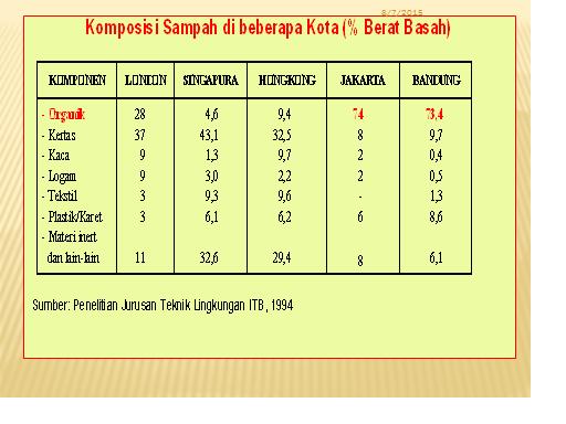 Pada kasus skala 350 ton sampah di Indonesia per hari, dengan mengacu pada pengalaman dan data hasil beberapa penelitian setelah dilakukan pemilahan semi manual ( kombinasi tenaga manusia dan Pemisah Logam (magnetic separator) dalam conveyor pemilah sampah (CPS), sampah kota dapat diklasifikasikan memiliki komposisi jenis organik 65 %, biomassa kering 20 %, plastik ( PE,PP, PS) 7.3 %, jenis plastik khusus PET 0,51 % serta 1,4 % ban dan 2,9 % karet (kabel, sol sepatu, dll) serta logam kaca.