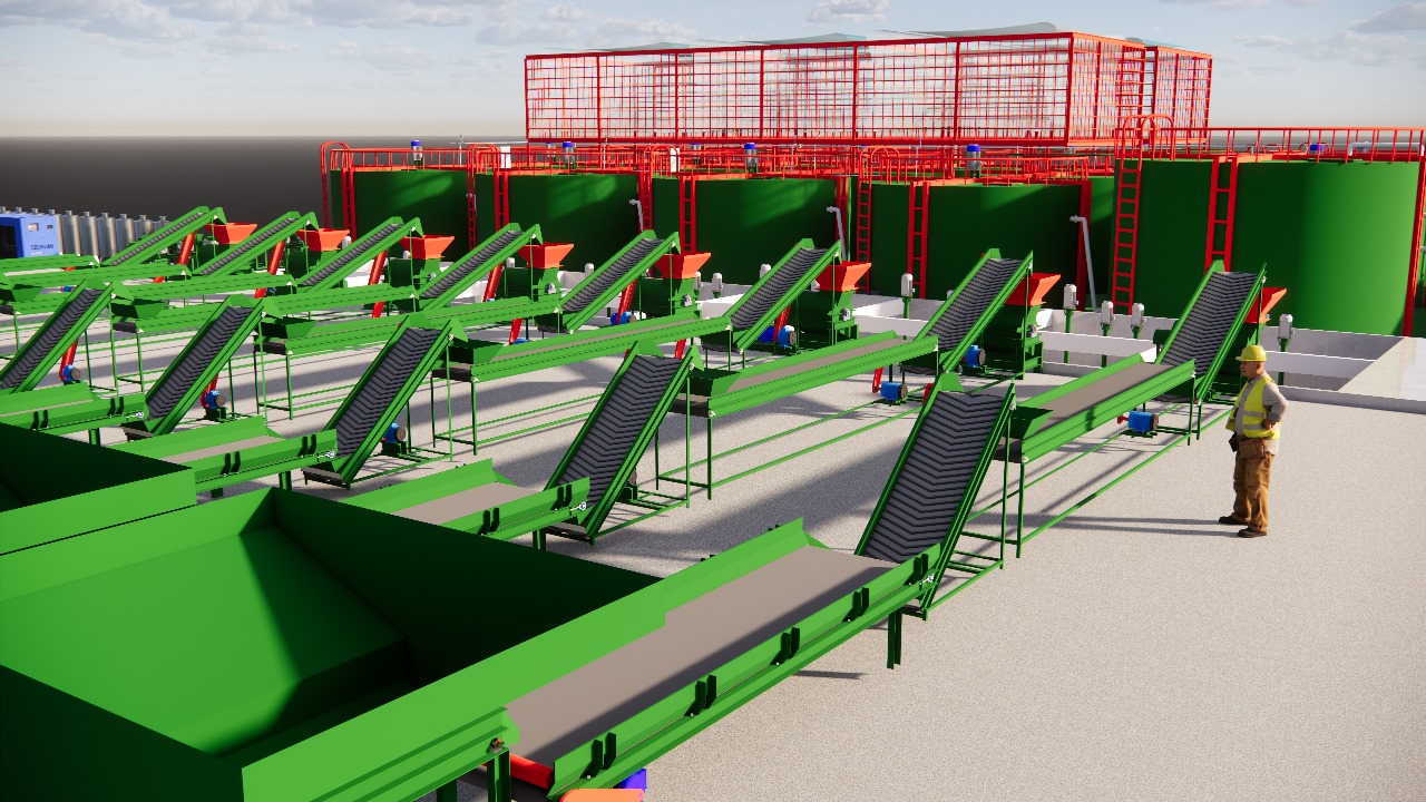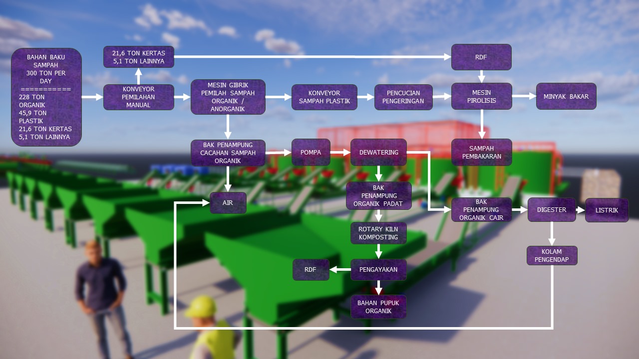 Merujuk data komposisi sampah di berbagai daerah Indonesia, perolehan dari hasil pemilahan pada conveyor dengan tenaga manusia dan magnetic separator dari 350 ton sampah akan diperoleh 227 ton organik, 70 ton biomassa kering (kayu, kertas, kain), 25,5 ton jenis plastik lain (PS, PP,PE) dan 15 ton jenis ban, karet serta sisanya jenis plastik PET, logam dan kaca. Perolehan hasil pemilahan, setelah dilalukan mesin pencacah organik dan mesin pencacah biomassa, karet dan plastik (schredder machine) adalah bahan baku bagi biodigester (wet process), pirolisis, komposter dan gasifier.