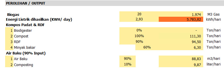 Output harian dari proses teknologi tersebut berupa Kompos (Pupuk Organik Granul), Refuse-derived fuel (RDF), minyak bakar hasil pirolisis plastik ( BBM Sintetik) serta biogas – hasil fermentasi organik dalam biodigester (anaerobic digestion). Perolehan biogas adalah bahan bakar generator pembangkitan energi listrik penyedia daya bagi bekerjanya mesin stasionary seperti conveyor, mesin pencacah aneka material (crusher and schredder) dan semua mesin pengolah sampah. Demikian pula perolehan dari reaktor pirolisis berupa minyak bakar (heavy oil) bagi bekerjanya engine stasionary serta BBM Sintetik digunakan bahan bakar pencampuran pada generator pembangkit listrik.