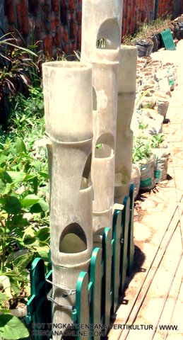 Pot Tingkat Vertikultur Kencana KVS 31N ( sistim pot bertingkat) adalah paket per 3 buah pot fiber resin berdimensi ( panjang/ tinggi 1m, diameter mulai 4 inchi, 2 buah pagar penjepit atau garden fence fiber 50 cm tinggi 25 cm), warna natural bambu.